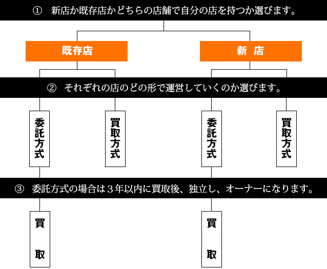 直営店で店長として働いていただきます。この期間に業績を上げるなどの実績をつくってください(業績が悪ければ降格もあります)。